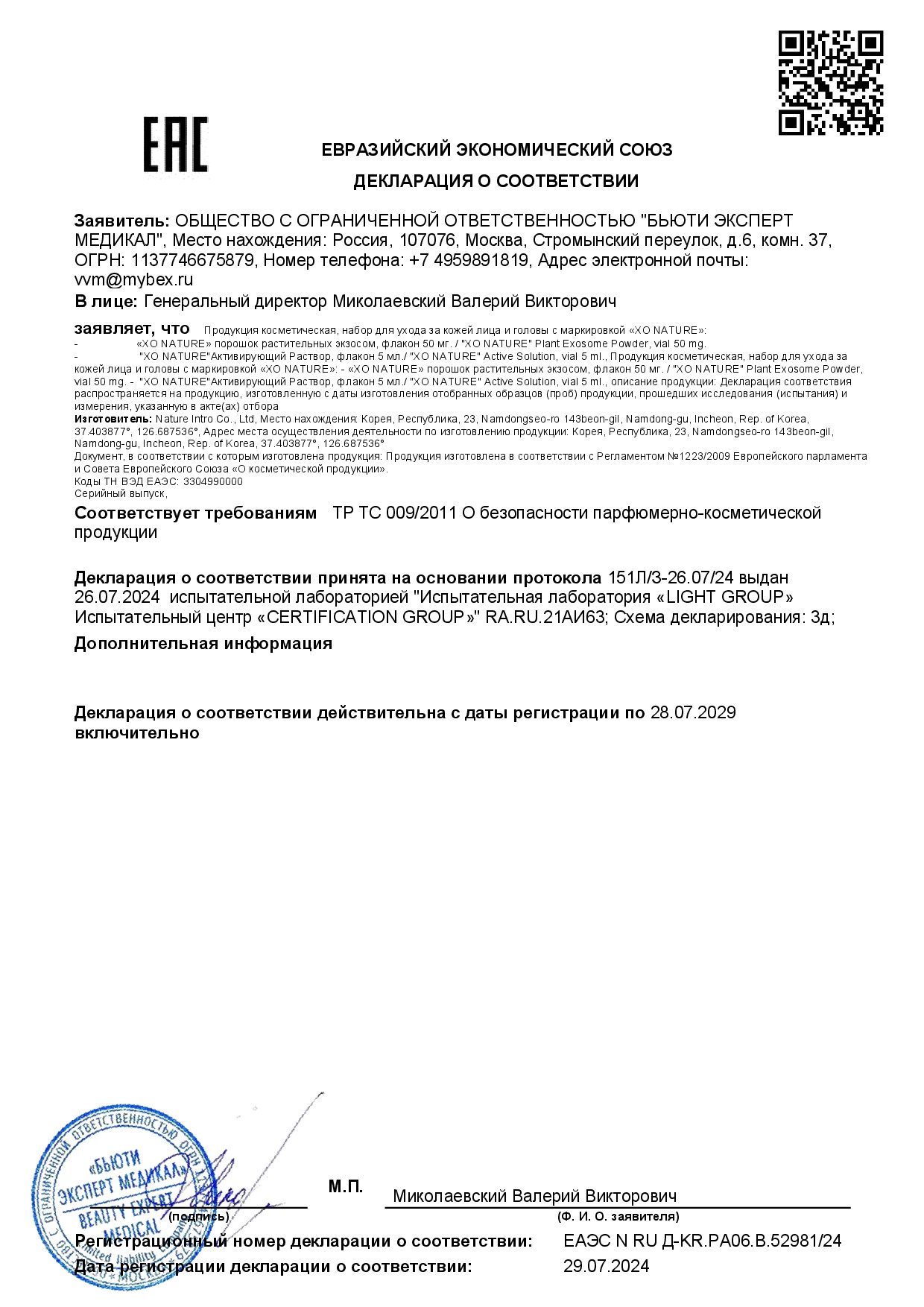 - Самая большая концентрация растительных экзосом — более 36 миллиардов частиц, смешанных с пептидами, цитокином, микроРНК, полифенолами, аминокислотами и гиалуроновой кислотой;